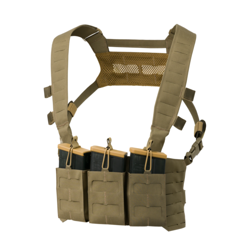 Curtiss® to hybrydowy chest rig z wszytymi na stałe trzema kieszeniami na magazynki 308 systemu HK, jak również każdy inny magazynek w kalibrze 308. Od góry magazynki zabezpieczone są elastycznymi uchwytami bungie cord. Funckjonalność chest riga zwiększają boczne panele systemu MOLLE/ PALS umożliwiające dopięcie dodatkowych kieszeni, co umożliwia dopasowanie chest riga do swoich potrzeb. System mocowania wycięto również na froncie kieszeni oraz na szelkach, co tylko zwiększyło możliwości konfiguracji. Szelki nośne zostały zaprojektowane w ten sposób żeby lepiej przenosić obciążenie i dawać większy komfort użytkownikowi. Dzięki temu zwiększyły się możliwości chest riga w zakresie ilości oraz ciężaru przenoszonego ładunku przy zachowaniu maksymalnego komfortu użytkowania. Z kolei duża, wewnętrzna, zapinana na rzep kieszeń pomieści płaskie przedmioty.
