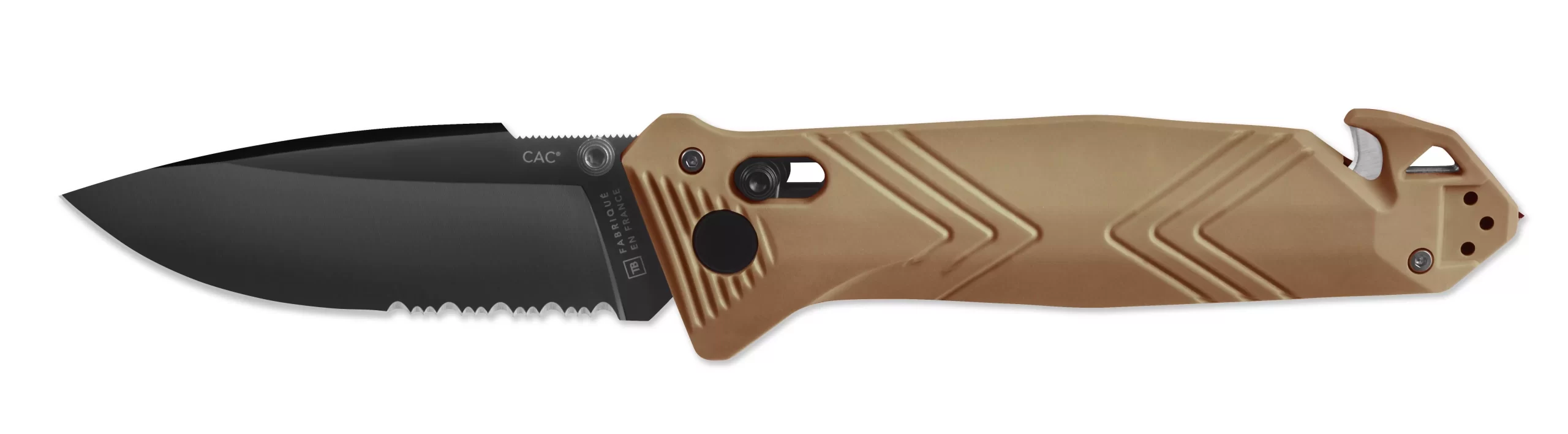 Składany nóż taktyczny z ząbkowanym ostrzem, który można obsługiwać jedną ręką. CAC to flagowy model TB Outdoor, który jest wykorzystywany przez francuską armię.