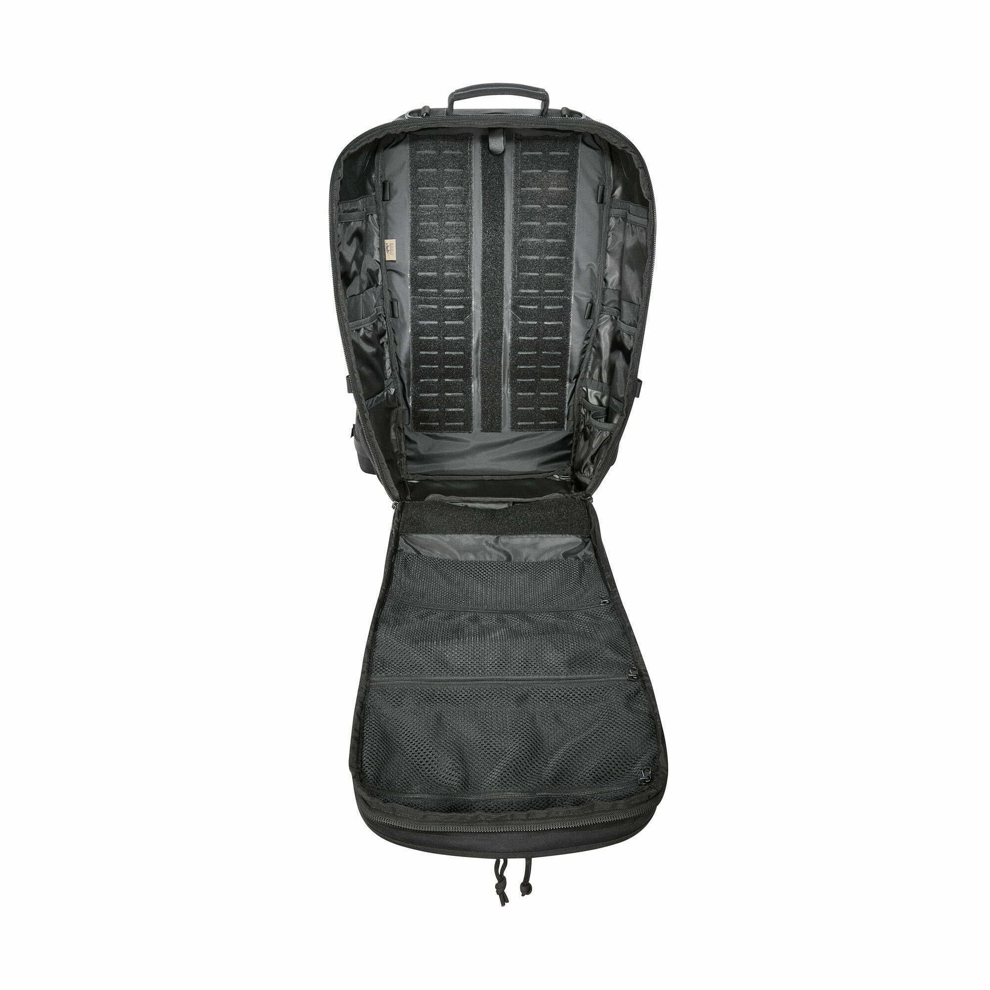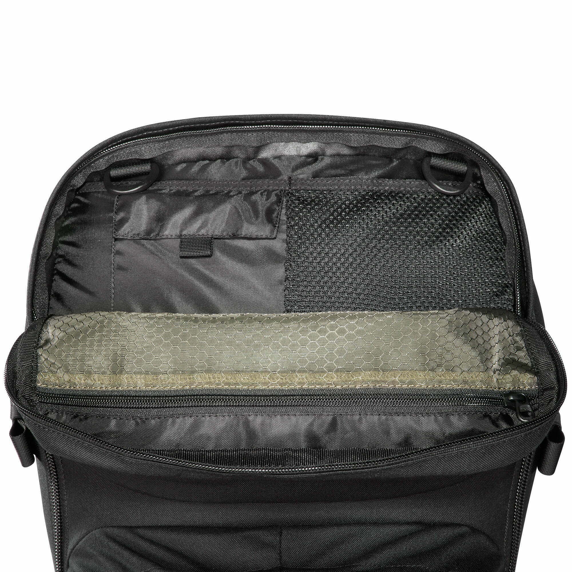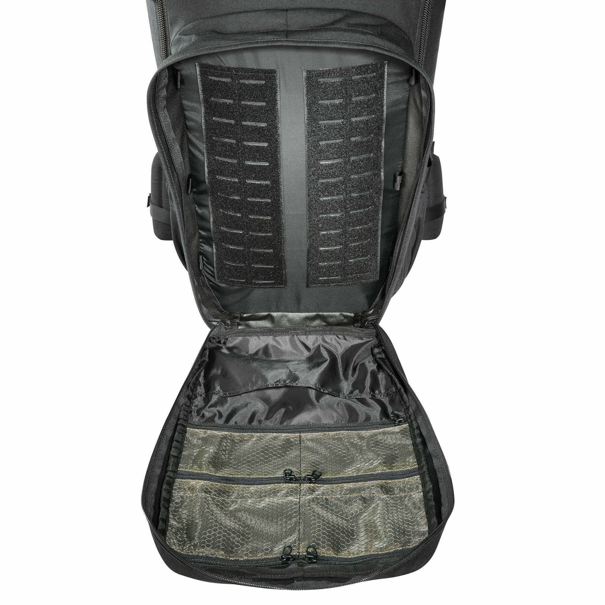 Wewnętrzne rzepy MOLLE i siatkowe kieszenie z zamkami ułatwiają segregację bagażu tak, by nawet najmniejsze akcesoria były zawsze w zasięgu ręki. Elementy systemu MOLLE rozmieszczone na froncie i bokach umożliwiają ponadto rozbudowę plecaka o dodatkowe moduły.